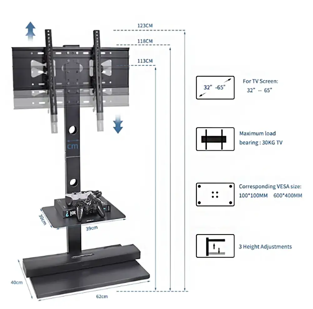 • Universal TV Wall Mount: This TV mount with shelves creates a modern look for your audio video equipment. Our articulating TV floor mount is compatible with most 32″-65″ televisions, including LED, LCD, Plasma, and flat screen monitors.